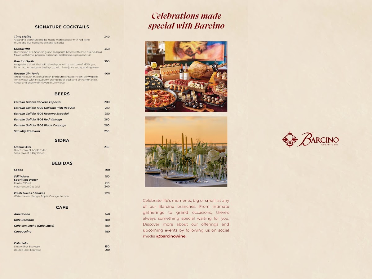 At Barcino - S Maison Menu, located at the heart of Pasay City, the dining experience is as vibrant as the surroundings. Situated on Level 2 of S Maison, with a stunning view of Seaside Blvd, this spot invites you to indulge in a menu that blends the finest flavors. Whether you're craving a rich selection of tapas, savoring flavorful paella, or enjoying expertly crafted cocktails, there's something for everyone here. The menu showcases a variety of Spanish-inspired dishes, made with fresh, locally-sourced ingredients that bring bold flavors to life. Each dish is a delightful experience, perfect for sharing with friends or enjoying solo. As you settle in, you’ll be transported into a relaxed yet sophisticated atmosphere, where every bite complements the dynamic vibe of the restaurant. Whether you're looking for a casual meal or a memorable night out, the Barcino - S Maison Menu offers a delicious escape.